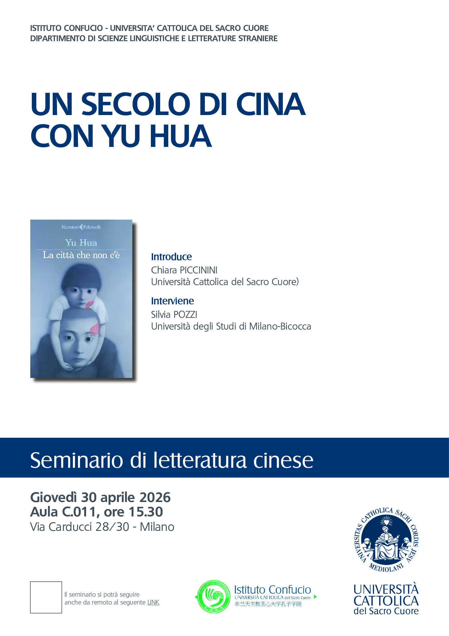 Il giorno 30 aprile 2026 a partire dalle ore 15:30 in aula C.011 in via Carducci 28/30, la professoressa Silvia Pozzi terrà un seminario di letteratura cinese dal titolo “Un […]