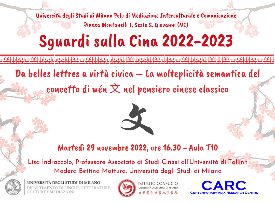 Conferenza di Lisa Indraccolo: “Da belles lettres a virtù civica – La molteplicità semantica del concetto di wén 文 nel pensiero cinese classico”