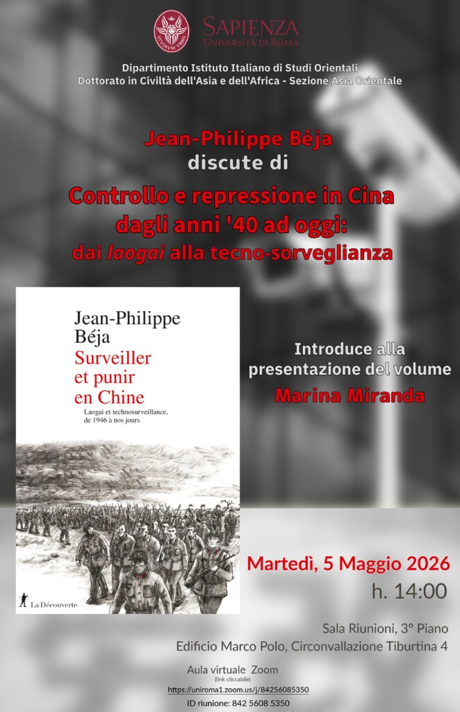 Il 5 maggio 2026, Jean-Philippe Béja, sinologo e politologo nonché direttore di ricerca emerito presso il Centre National de la Recherche Scientifique (CNRS) / Centre d’Études et de Recherches Internationales (CERI) di Parigi, presenterà la sua più recente opera, Surveiller et punir en Chine – Laogaï et technosurveillance de 1946 à nos jours (La Découverte, Paris, 2026). Nel corso dell’incontro, la discussione verterà sul sistema di repressione e controllo della popolazione in Cina dagli anni ’40 ad oggi, con particolare attenzione alla sua evoluzione e al progressivo affinamento delle sue forme, sempre più sofisticate: dai campi di lavoro forzato e di rieducazione (i laogai), al più attuale modello della tecno-sorveglianza. È questo un tema particolarmente sensibile, cui l’autore ha dedicato coraggiose e rigorose ricerche, dando voce alle vittime di tale apparato coercitivo e mettendo in luce le implicazioni sociali e umane di tali forme di disciplinamento.
