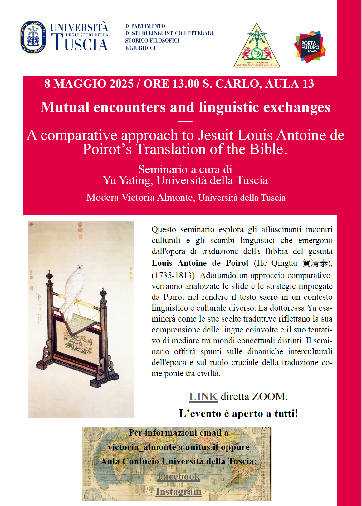 Settimo evento Confutuscia: Mutual encounters and linguistic exchanges ― A comparative approach to Jesuit Louis Antoine de Poirot’s Translation of the Bible, seminario a cura di Yu Yating.