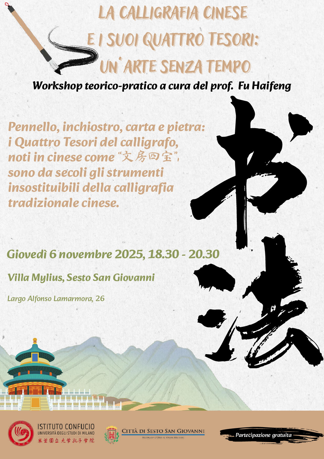 Workshop teorico-pratico a cura del prof. Fu Haifeng Organizzato da Istituto Confucio dell’Università degli Studi di Milano in collaborazione con il comune di Sesto San Giovanni Per maggiori informazioni: https://www.istitutoconfucio.unimi.it/evento/la-calligrafia-cinese-e-i-suoi-quattro-tesori-unarte-senza-tempo/